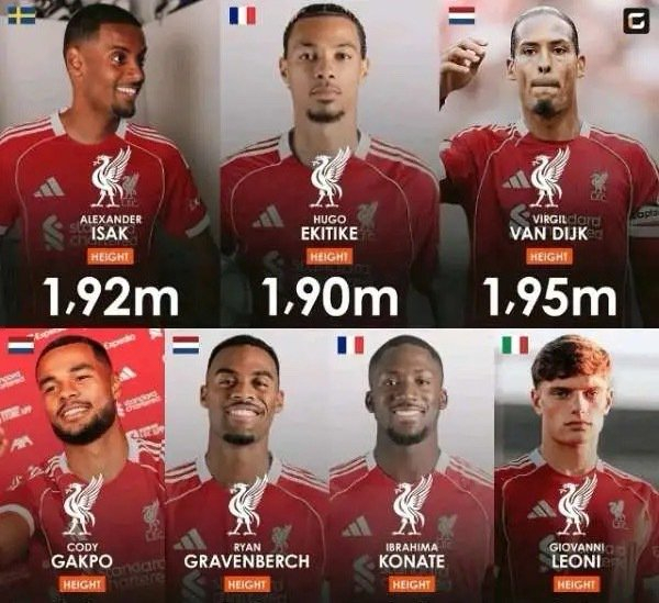 真没想到,利物浦阵中竟有7人身高在1米9以上(不包含门将),妥妥的是英超第一高度啊。特别是今夏新引进的前锋伊萨克、埃基蒂克和后卫莱奥尼都在1米9以上。